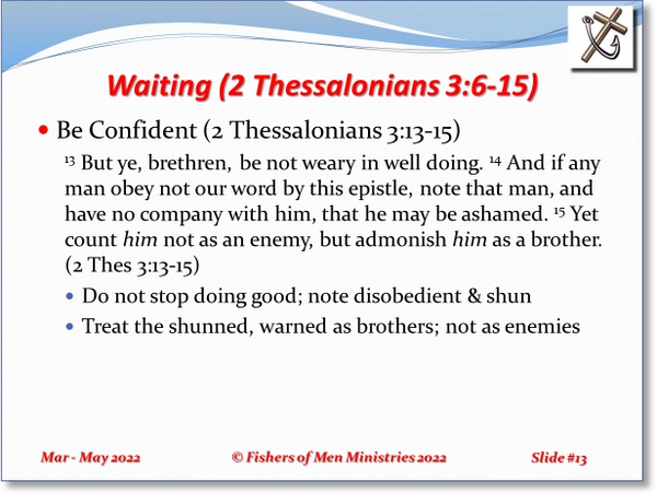 This point surfaces an issue that does not feel really clean in Christian ethics. We can deal with verse 13 fairly easy because it contains a simple and appropriate statement. Notice the transitional beginning of the verse is the word, “but.” It generally means alternatively, or not the same. Here, it is not the same as the problem with the busybodies. So, discounting the busybodies, the members of this church should never be weary in doing well for others. It is great advice for Christians everywhere. We should never get tired of doing good things for our fellow members.