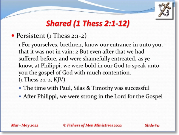 The first chapter of 1 Thessalonians discusses strength of faith for the new believers and their relentless dedication to spreading the Gospel. It was uncanny that the Thessalonians were mentioned as examples of the Christian faith in Greece and the Roman Empire this early in their movement toward Christ! (I Thess 1:7-8).