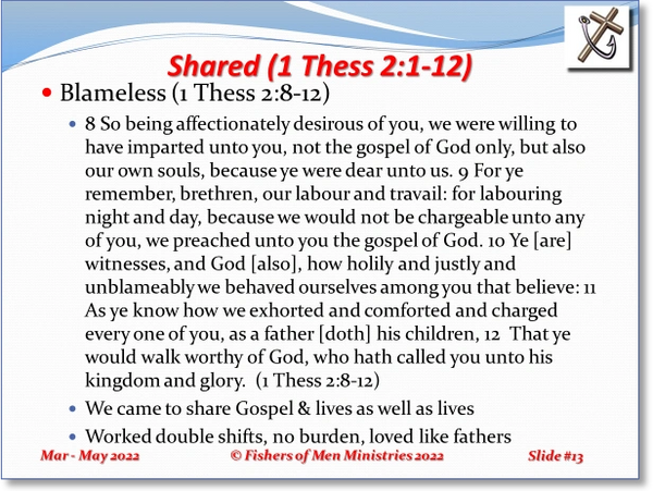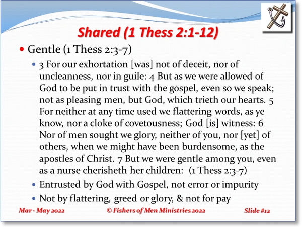 Paul believes the most obvious evidence of the truth of his comments is that, as Apostles of Christ, they had a right to some monetary remuneration, but never asked for any support whatsoever. Instead, the team was gentle among the Thessalonian saints. Even as far as showing concern like a nurse loves and cares for the children assigned to his or her care.