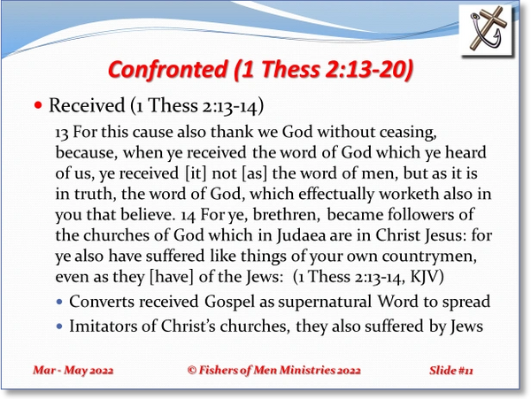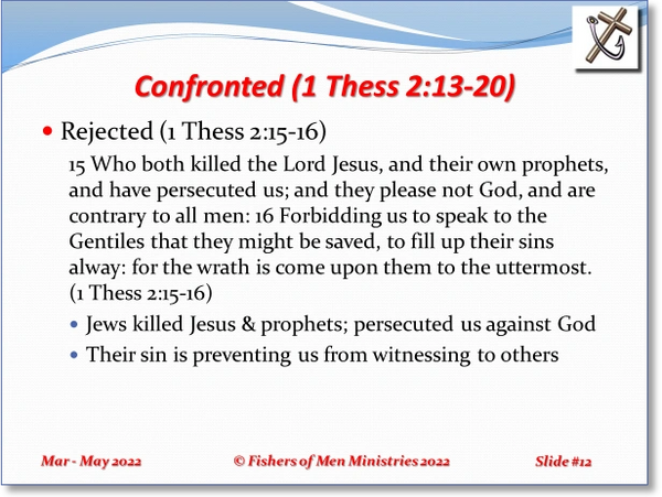 Along with the great strength and power God gives us through the Holy Spirit comes the reenergized attacks of the opposition: Satan and his demons (1 Pet 5:8). Paul warns the new believers of Thessalonica that just as they have become a rapidly growing new church, they have also imitated the earlier churches in waking up Satan against them. Here, like many other churches started where active synagogues existed, the devout Jews opposed the conversion of Jews to Christianity because of the losses in their numbers. Paul says this new church is imitating (or following after) the churches of Judea because they were beginning to feel the same persecution from the Jews as they did. The Jews continued to reject the Gospel and those who have accepted it. As those trials and temptations come, recall the teaching of James, the half-brother of Jesus, as he encouraged us, “2 My brethren, count it all joy when ye fall into divers temptations; 3 Knowing [this], that the trying of your faith worketh patience. 4 But let patience have [her] perfect work, that ye may be perfect and entire, wanting nothing” (Jas 1:2-4).