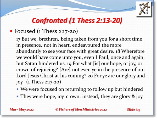 Now, Paul wants to make sure the new believers in Thessalonica know his heart concerning being taken away from them before he could give them a good foundation in the Lord. He wanted to begin their discipleship process, so he could pass all the great and wonderful experiences they could expect as they grew in Christ. But Paul’s team was forced to leave much too quickly to allow any discipleship at all. Paul emphasized that while they may have been forced from their physical presence, they never moved from their spiritual presence with them in their hearts. Paul says they tried very hard to get back because they missed seeing their faces and were longing to see them again. Sometimes we talk in general about coming back to a church to see old friends but leave out the fact that it is the images of the individual faces that we long to see again. Speaking only of the church loses some of the personal feelings for each of the people. Paul eagerly awaited seeing each of them again. He says that he had tried several times personally, but Satan hindered the entire team from returning together or separately. Recall that the Christian persecution was increasing. There was certainly a price on Paul’s head because he was known so well previously as the Jews’ greatest persecutor of the Christians. After his Damascus Road experience with Christ, he became the most notorious. Paul had such a zeal for sharing the Gospel that he led a large number of the Royal Guard placed on him while in prison in Rome to Christ. When Paul was forced to testify before King Herod Agrippa, the king accused Paul trying to lead him to Christ.