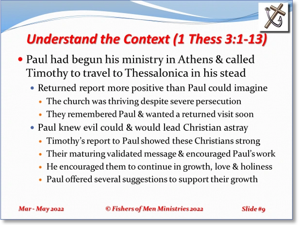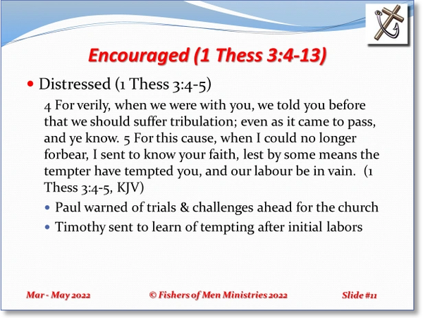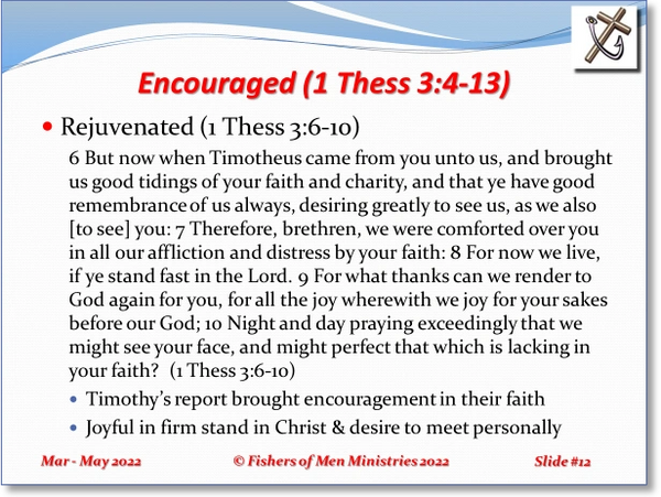 Soon, it was time for Timothy’s first report from Thessalonica to update Paul at Athens. Paul stated that when Timothy came to him, he said the saints at Thessalonica were very strong and brought good tidings of their faith in God and their love for one another and for others (vs. 6). The maturity with which the saints were growing served to further validate the Gospel of Christ and brought great encouragement to Paul in his work in Athens and beyond (vss. 6-7). It is always a great encouragement to ministers to see the people who were converted in their ministries growing in Christ and making more converts and developing stronger disciples of Christ. Paul said simply, “For now we live, if ye stand in the Lord” (vs. 8). That is, the good news of their growth in Christ became an encouragement for Paul in nis ministries.