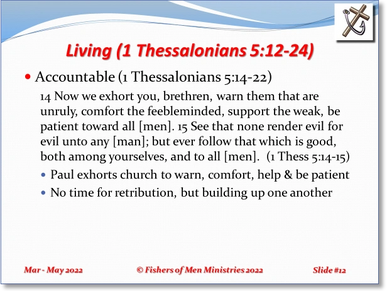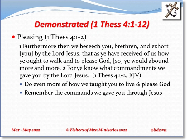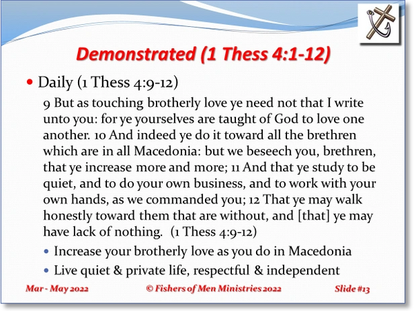 In Chapter 4, Paul writes for the Thessalonian Church to show their love for Christ in all of their routine activities of the day like actions, attitudes, speech and relationships. These behaviors could be used to show the differences that knowing Christ has made in the new person created by their new beliefs (Rom 12:1). Many prospects for Christianity will react more favorably to what they see in Christian behavior than what they hear from Christian speakers. James says it this way: “14 What [doth it] profit, my brethren, though a man say he hath faith, and have not works? can faith save him? 15 If a brother or sister be naked, and destitute of daily food, 16 And one of you say unto them, Depart in peace, be [ye] warmed and filled; notwithstanding ye give them not those things which are needful to the body; what [doth it] profit? 17 Even so faith, if it hath not works, is dead, being alone (James 2:14-17, KJV). Some have said that our actions speak much more loudly than our words.