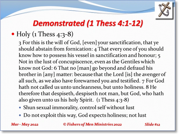 Paul explains that God has not called us to uncleanness but to holiness (vs. 7). Further, it is not a man that is despised, hated or disrespected with these sins, but the one who does them shows contempt for God. Paul adds that it is God who gave us the indwelling Holy Spirit. So, the two ideas brought together suggests that God has given us the indwelling Spirit at the instant of our belief in Him. With that Spirit comes the power to abstain from any and all sin. In other words, the only sin we commit is that sin which we have agreed with ourselves to yield to. We have the power over it through the Holy Spirit, but we chose to do the sin anyway. Paul is using some very powerful words and thoughts here.