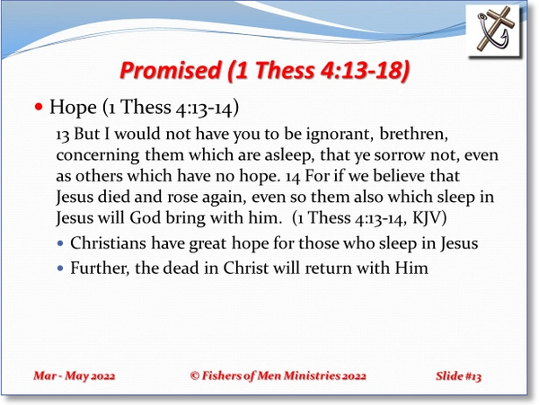 One final set of doctrines mentioned here is that Christians are waiting for Jesus to return from heaven, that God had raised Him from the dead, and that Jesus delivered us from the coming wrath of God. We wait for Jesus to return because He is coming for us and will take us with Him. We can use his words to get a short description of what His promise is. He said, “1 Let not your heart be troubled: ye believe in God, believe also in me. 2 In my Father's house are many mansions: if [it were] not [so], I would have told you. I go to prepare a place for you. 3 And if I go and prepare a place for you, I will come again, and receive you unto myself; that where I am, [there] ye may be also” (John 14:1-3, KJV).