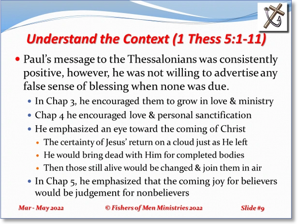 So, what is here for us today? Primarily, it is knowledge and certainty of the end times. The people of Thessalonica were being tempted with a lie that the return of Christ had already begun, and they somehow missed it. It was false doctrine orchestrated to bring doubt on their experience with Jesus Christ resulting from the Gospel delivered by Paul and his team. It is a warning to us that the tempter has not and will not stop his work to rob the lost from finding Christ and rob the saved from enjoying their power over sin. It is another warning that we need to be prepared for the revealing of the Antichrist. We need to be confident of our salvation in Christ and the eternal security that salvation brings. Satan and his demons will never stop trying to convince us that the Gospel is a myth or some impossible dream. Peter was the first apostle to recognize Jesus as the Messiah, the Son of the living God, yet he was the one who denied Him three times (Matt 16:16, 26:74-75, Mark 14:61, 72, Luke 9:20, 22:61, John 18:27). Satan tried to convince Peter that his faith was flawed and that his salvation was lost, but it was Jesus who said to Peter, “if you love me, feed my sheep” (John 21:15-17). Peter was sorely disappointed in himself and exceedingly sorry for denying the One he loved, but he was not lost, nor was his responsibility reduced in spreading the Gospel of Jesus Christ. Recall that as Jesus died, He said “It is finished” (John 19:30). The proper Greek word (not the one published in Strong’s) is intetelestai. The significance of the difference is that the root word (telos – in Strong’s) is the term used in Jesus’ day for a debt with is totally discharged, i.s., “paid in full.” Adding the Greek verb tenses for past, present, future and for all time to telos results in the word tetelestai. Jesus said our sin debt was paid for past sin, present sin, future sin and the sin of all time and eternity. Paul said it very well in Romans 8:1, “There is therefore now no condemnation to them which are in Christ Jesus.” As usual, Paul comes up with the most pertinent question, “What shall we then say to these things? If God be for us, who can be against us?” (Rom 8:31).
