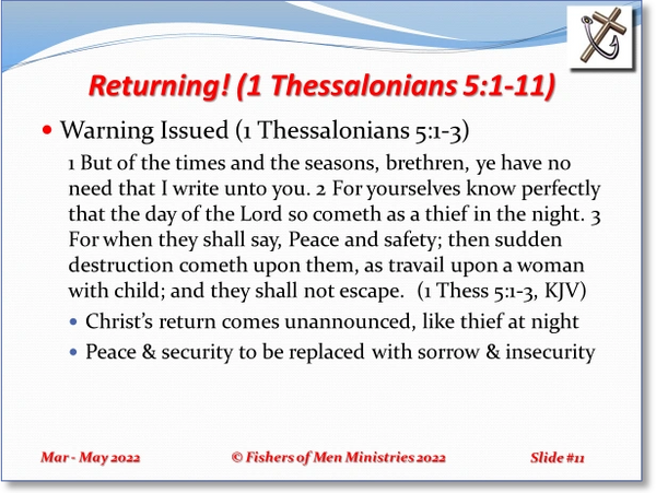 The Apostle Paul’s first letter to the Thessalonians concludes with this set of Scripture. Paul purposely details the return of Jesus Christ for His church in a unique way to clearly segregate two separate and distinct returns of Christ. The first was one was detailed in last week’s study and is called the Rapture, the Rapture of the Saints or the Rapture of the Church (1 Cor 15: 51-58, 1 Thess 4:13-18 & Rev 4:1). In this event, Jesus returns on a cloud, never touching the earth, and brings the souls of the dead believers with Him. Their bodies are raised from their graves as the cloud descends toward the earth, and their souls and bodies are reunited in the air. Then, the bodies of the living believers are changed and taken up in the cloud with the Lord and the resurrected dead believers to Heaven. Paul’s summary words on the Rapture are documented in 1 Thessalonians 4:18 as, “Wherefore comfort one another with these words.”