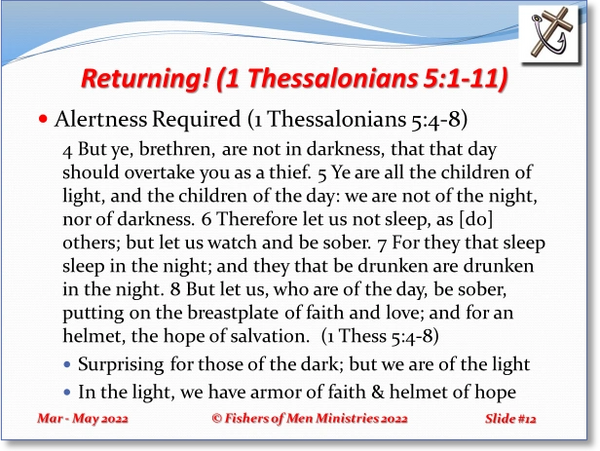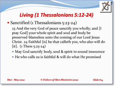 Paul’s prayer for us in verse 23 is that the God of peace will help us to be sanctified completely. He specifies that completeness to include our whole being: body, soul and spirit. He is pledging his prayers to God on our behalf that God will preserve each part of our being totally blameless until the Lord Jesus Christ returns for us. Our part in responding to Paul’s prayer is to watch and “count it all joy” for the trials that enter our lives knowing first that whatever the trial is, God has already prepared us to defeat it, and second, that our growth in Him includes meeting these challenges head-on until we get the great victory of knowing there is no sin confronting us that we have not been given power to defeat. When these victories become commonplace, and we realize the immense power of the Holy Spirit inside us, we have made still another step in the process of sanctification. Of course, the only way that the time period Paul mentioned can be changed is if we go on the be with Him before He returns. Either way, we move from sanctification to glorification as we enter the gates of Heaven to be with Him forever.