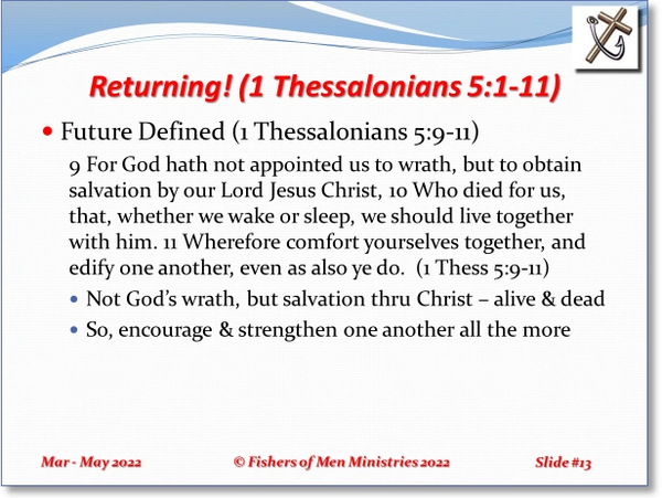 Verse 5:10 drills down on that truth a little further by reiterating that Jesus died for us, so that whether we are alive or dead, we will certainly live together with Jesus when He comes for us. And rightfully, he emphasizes that we should speak these words one to another to comfort ourselves even as we have been doing all along. This, in fact, is the good news of the Gospel of Jesus Christ.