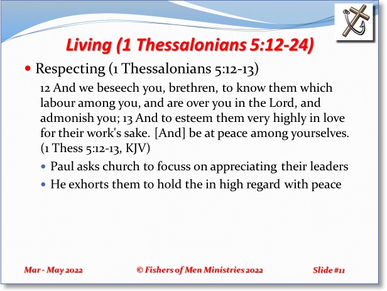 Verse 12 starts the discussion with Paul saying we need to look around us at those people who play the roles of leadership in our lives. They are the ones who work around us. Some of them are appointed over us and they have the responsibility to admonish or direct us in the way we should go. Paul directs us to get to know who these people are and to pay attention to what they are doing and saying to help us move forward in the Lord. We are compelled to accept the fact that these people are supernaturally appointed to see things happening in our spiritual lives that we may not be able to see because we are too close to notice them. By them seeing and reporting these areas for improvement, we can spend more time fixing them than continuing to add more and more new tasks without completing older tasks.