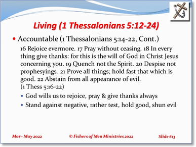 Verses 18-22 contain a checklist for holding ourselves accountable for the work we do, especially when we are required to deal with others. The first element is to “give thanks for everything” (vs. 18). Starting any assignment with gratitude for having the assignment is a great way to control how we approach the task. Here Paul says, “this is the will of God in Jesus Christ concerning us.” He can speak with authority on God’s will because of his demonstrated focus on doing God’s will regardless of what it costs him. Further, when it comes to our walk with Christ, simply knowing what He went through on our behalf is sufficient to engender a spirit of gratitude in our hearts. And, that gratitude is easily passed on to those with whom we interact.