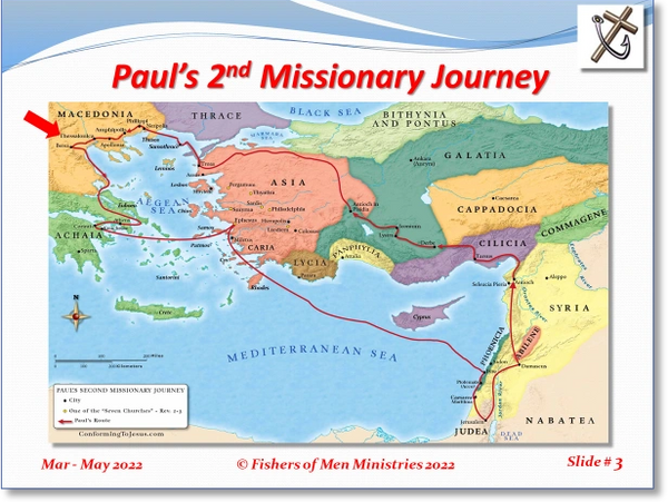 Here is a map of Paul’s Second Missionary Journey with a red arrow showing where Thessalonica is located. Notice also that the confrontation with the devout Jews at Thessalonica did not end the missionary trip; it simply moved Paul and Silas to a different location. They had a great deal more work to do before the trip ended. It did result in Paul setting up some immediate ministry services for them and part of that work would be the writing of 1 Thessalonians from Corinth during this same trip. There will be more detail on the timing of 1 and 2 Thessalonians in this first study.